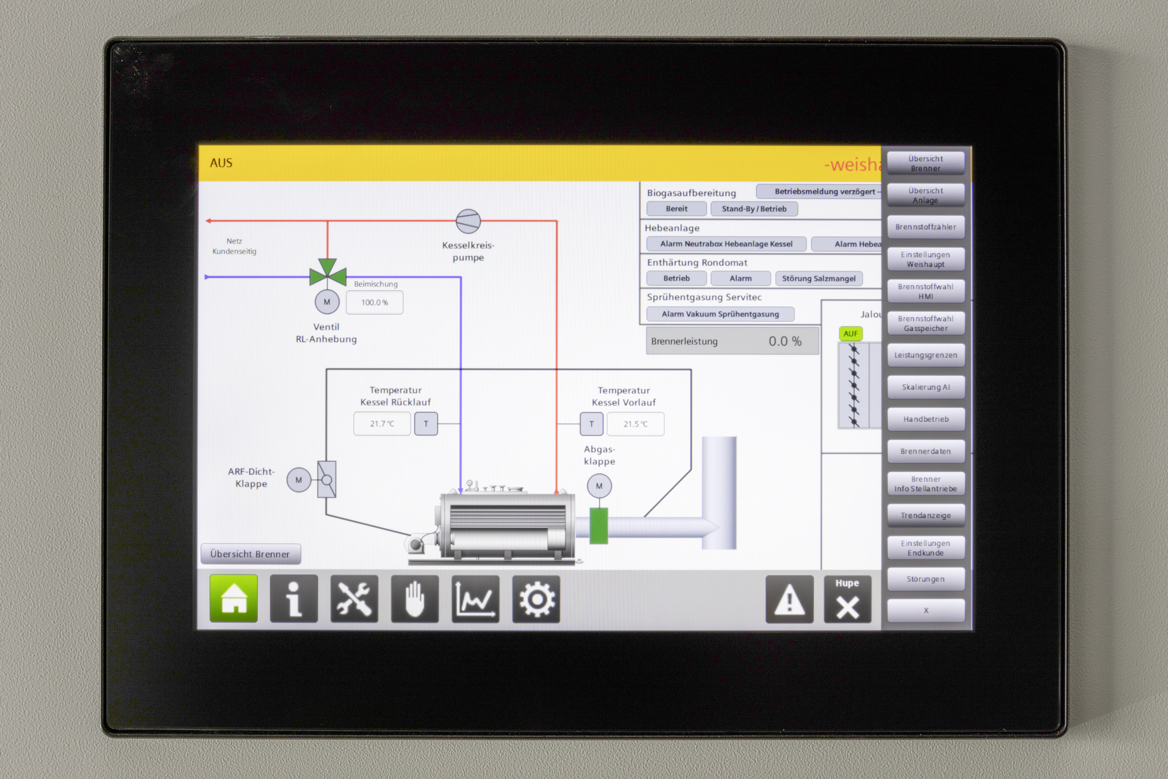 So auch im Südzucker-Werk im bayerischen Rain am Lech. Dort ist in einem neu gebauten Kesselhaus ein Weishaupt monarch® Zweigasbrenner WM-G50 im Einsatz, der Biogas und Erdgas im Einzel- oder Simultanbetrieb als Brennstoff verwendet. Da die verfügbare Menge an Biogas schwanken kann, wird im Simultanbetrieb regeltechnisch “fliegend” zwischen 8 Kurvensätzen mit mehr oder weniger Biogasanteil umgeschaltet. Die Ansteuerung der Biogasversorgung und Kesselregelung übernimmt eine Weishaupt Schaltanlage mit Brennersteuerung, zusätzlicher SPS und Touchpanel.