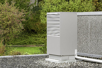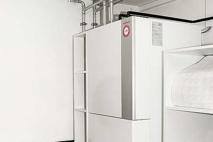 Bei der Aeroblock® befinden sich im Gegensatz zur Biblock® alle wesentlichen Bauteile wie Verdampfer und Verdichter nicht im Innen-, sondern im Außengerät. Sie eignet sich somit hervorragend, wenn im Inneren des Hauses wenig Platz zur Verfügung steht, wie dies bei Terrassenhäusern der Fall ist. Platziert wurde das Außengerät auf dem Dach. Dank der Bauweise des korrosionsbeständigen Gehäuses ist das Gerät auch für die freie Aufstellung bestens geeignet. Der Kombispeicher WKS 300/100 mit integrierter Steuerung fand in der Waschküche Platz und nimmt nicht mehr Raum ein als der bisherige Warmwasserspeicher. Für das Verlegen der Anschlussleitungen konnte praktischerweise das bestehende Rohr, das bisher als Kaminausgang der Gasheizung diente, verwendet werden.