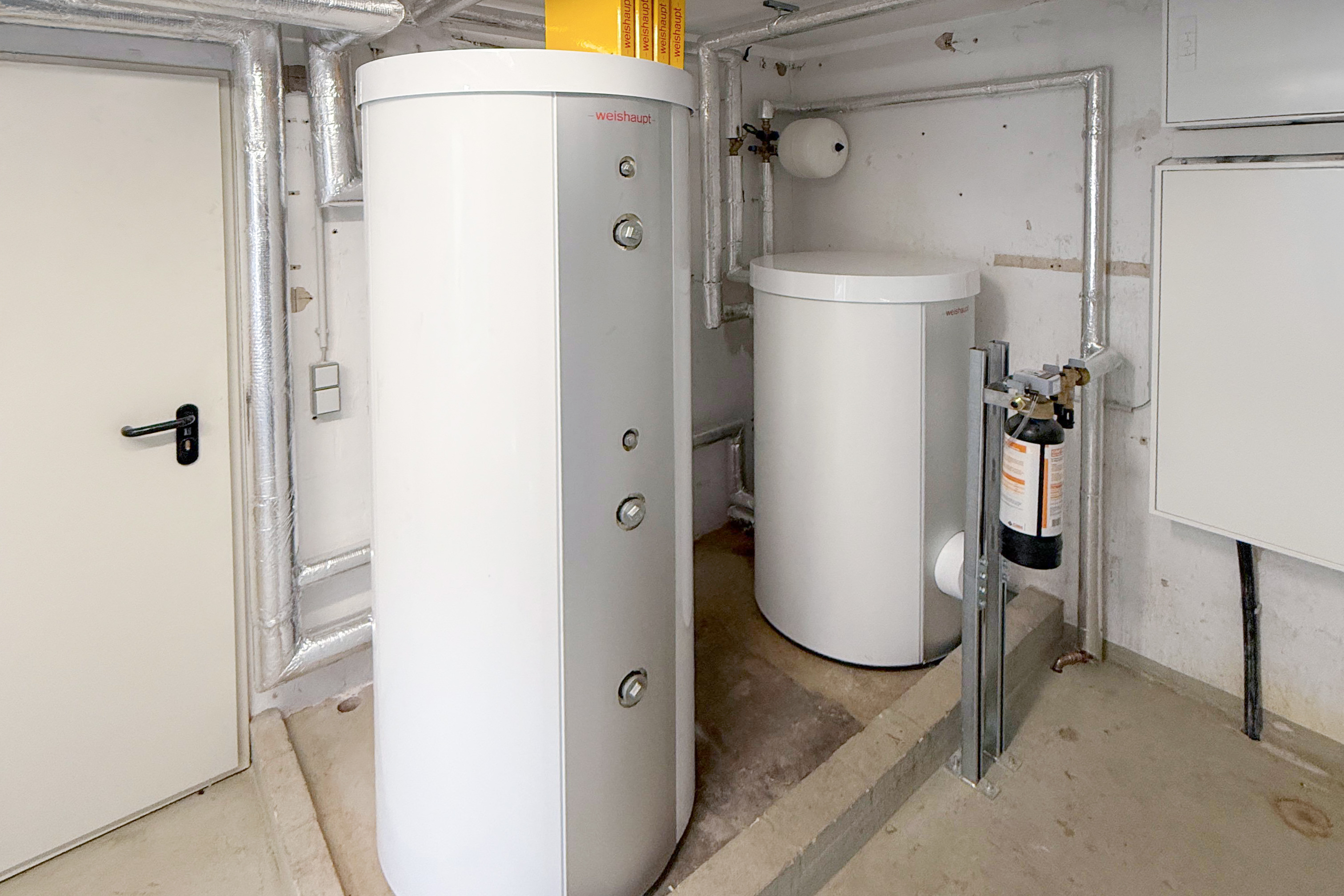 Die zwei Weishaupt Warmwasserspeicher für das Pfarrhaus.